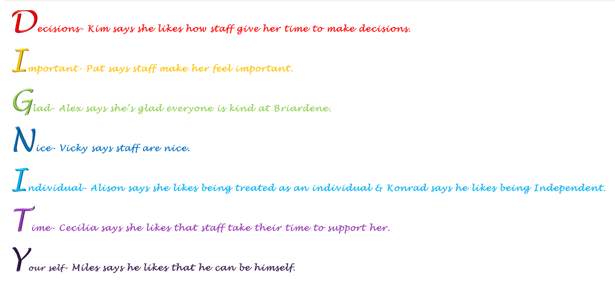 Our residents explained what they did...“We chatted about dignity, but we were not sure what it means so we decided to use our own words, staff helped us so that our words spell out the word ‘Dignity’.”